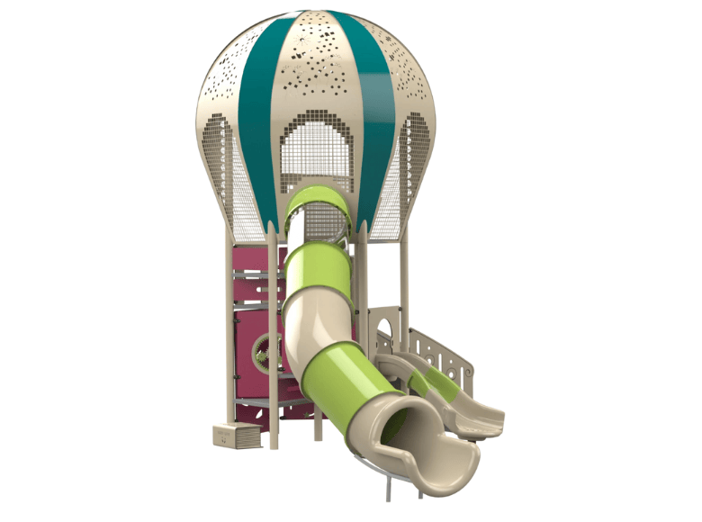 The Psagot Playgrounds Balloons 1 is a hot air balloon-shaped play system with 6 levels of activity packed into one structure. Kids climb up via a climbing wall, rope ladder, or accessible stairs, then come down through a tube slide, a straight slide, or a toddler slide. There is a balcony, 2 play panels, and a giant balloon dome crowning the top. It holds 56 kids at once, ages 5-12. ASTM F1487 and IPEMA certified.