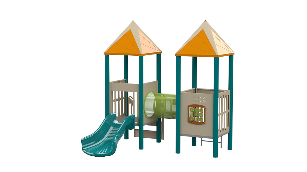 Here's the thing about playground equipment for kids under two — most of it is either too simple to hold their attention or not truly designed for that age group. The Baton Rouge threads the needle. The crawling tunnel between the two towers is ventilated so caregivers can see in and air circulates, but it still gives toddlers that enclosed exploration experience they're drawn to. The climbing elements and play panels build motor skills without putting kids in positions they can't handle.