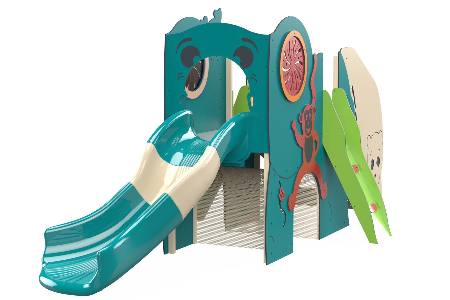 The Happy Jungle matters to me because accessibility shouldn't be an afterthought on a playground. This structure is designed from the ground up so children with different abilities can join in — the entry points, the game panel height, and the overall layout all account for varied mobility levels. The attached game panel adds fine motor and cognitive work alongside the physical elements, so kids get a well-rounded play experience.