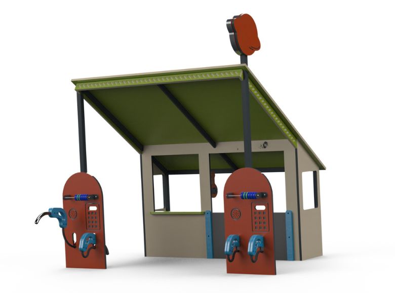 I carry a lot of toddler structures, but the Junior Gas Station is one of the few where the role-play props feel specific enough to hold a 3-year-old's attention. The removable fuel pumps and receipts give kids a sequence to follow — pull up, pump gas, get a receipt, drive out through the rubber door. That kind of structured pretend play builds language and social skills in ways a generic playhouse does not.