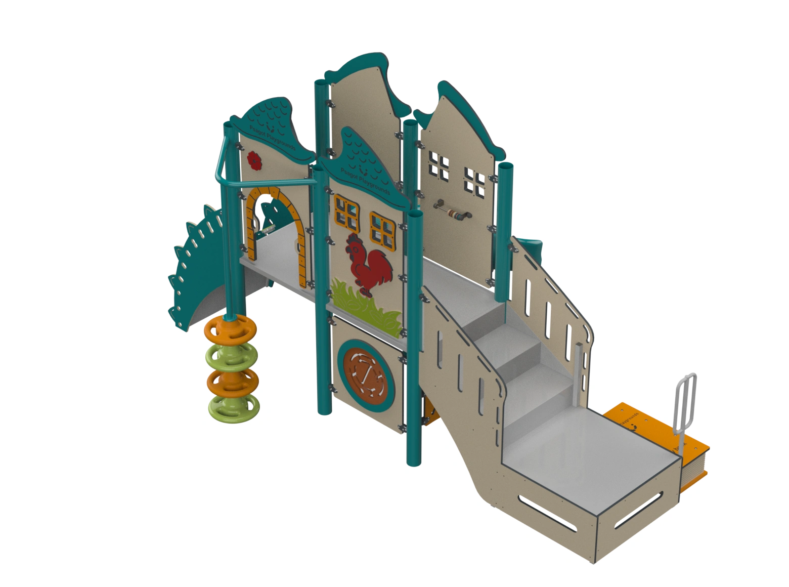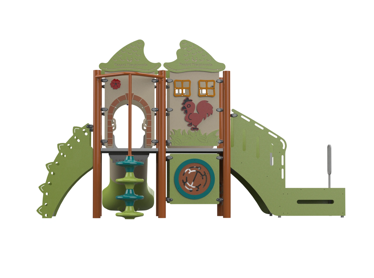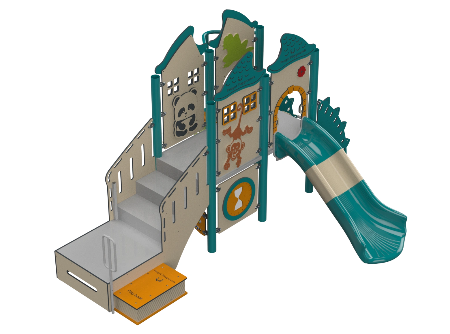 The Psagot Playgrounds Mouna KeaB takes a nature-and-animal theme and builds a toddler structure around it — climbing and sliding elements sized for 2-to-5-year-olds, wrapped in colorful animal-inspired design. I find that themed structures like this hold younger kids' attention longer because they're not just playing on equipment, they're playing in a world. HDPE from recycled materials, capacity for 20 children. ASTM F1487 and IPEMA certified.