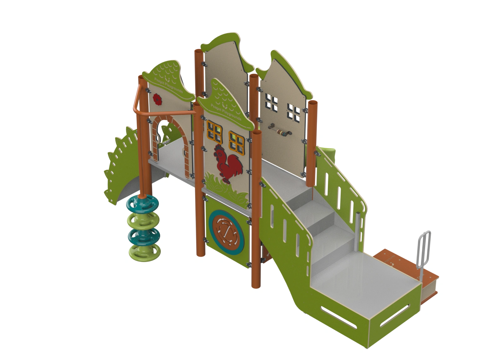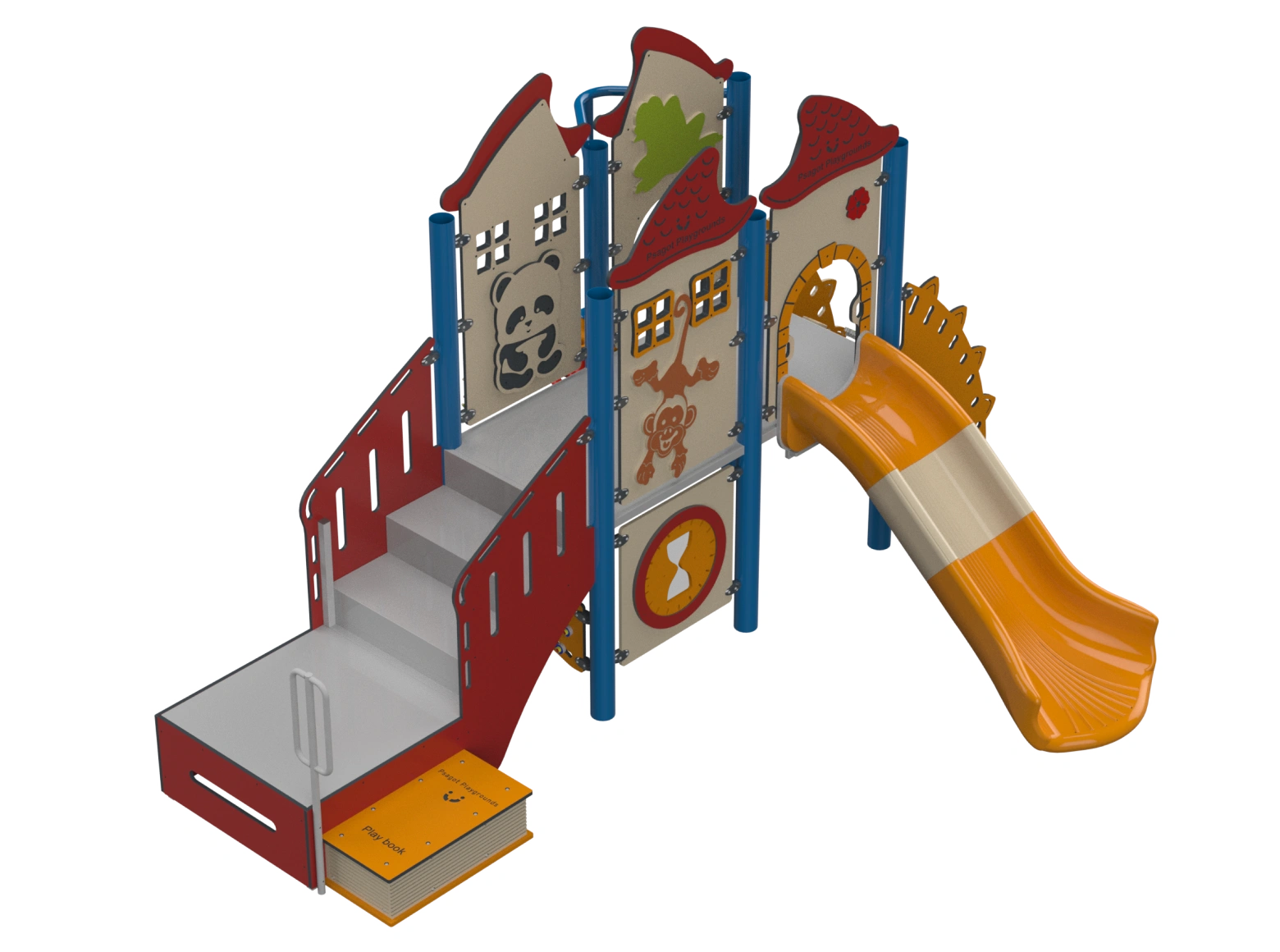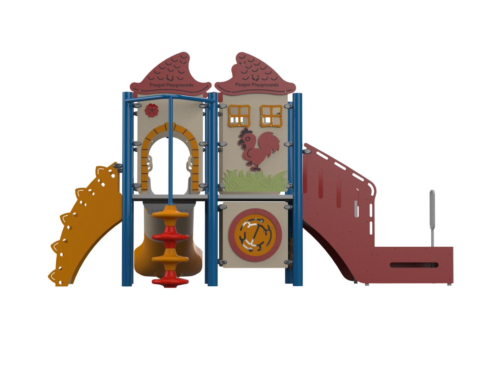 The Psagot Playgrounds Mouna KeaB takes a nature-and-animal theme and builds a toddler structure around it — climbing and sliding elements sized for 2-to-5-year-olds, wrapped in colorful animal-inspired design. I find that themed structures like this hold younger kids' attention longer because they're not just playing on equipment, they're playing in a world. HDPE from recycled materials, capacity for 20 children. ASTM F1487 and IPEMA certified.