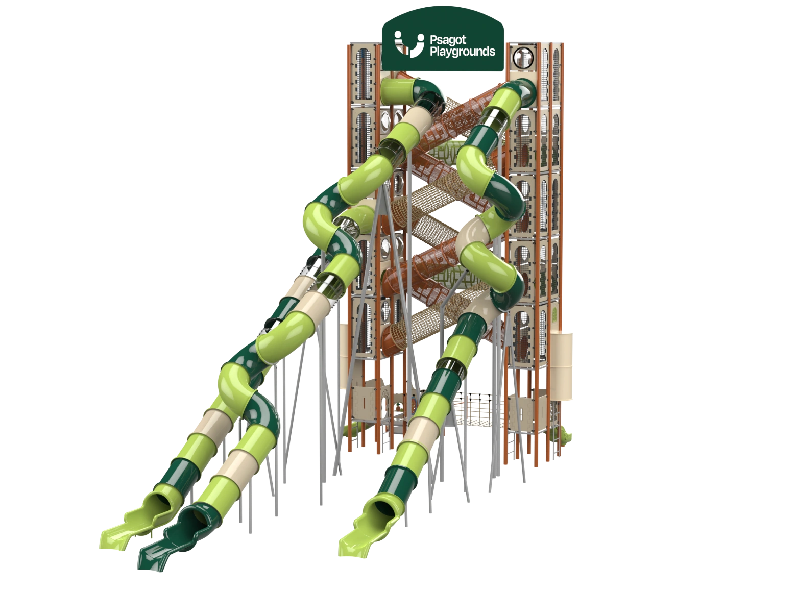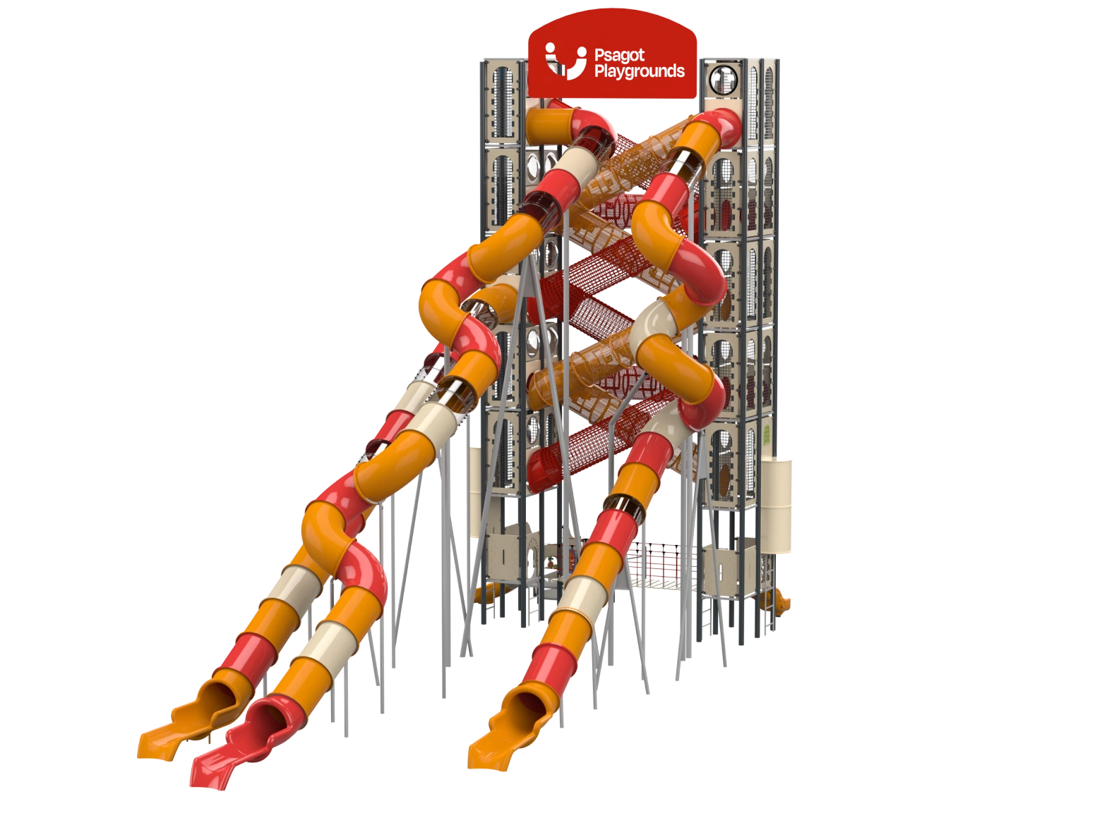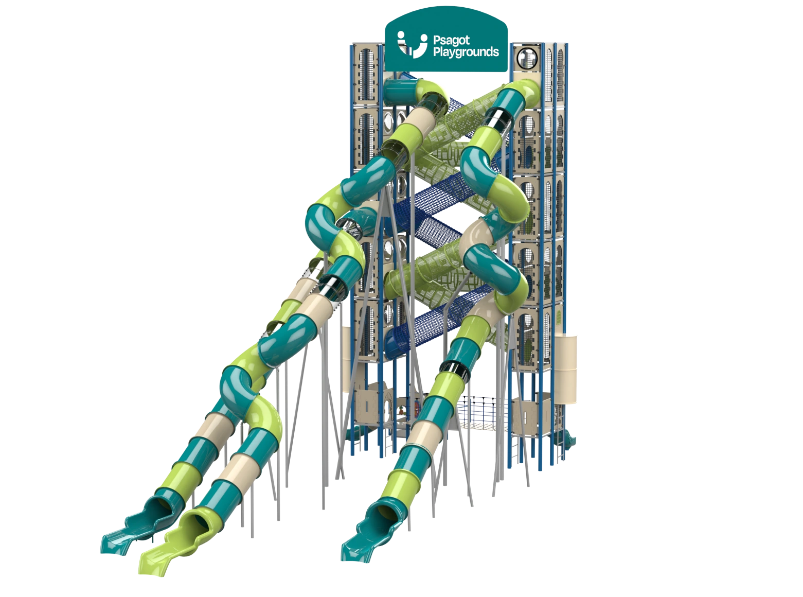 The Los Angeles is the biggest structure in Psagot's Steel line, and it's built to be a destination. Tall towers with transparent panel segments and slide sections mean caregivers on the ground can see kids playing at height — a design detail that sounds small but changes the whole experience for parents. Bridges, climbing elements, and multi-level play zones for up to 130 children. Ages 5-12, ASTM F1487 and IPEMA certified.