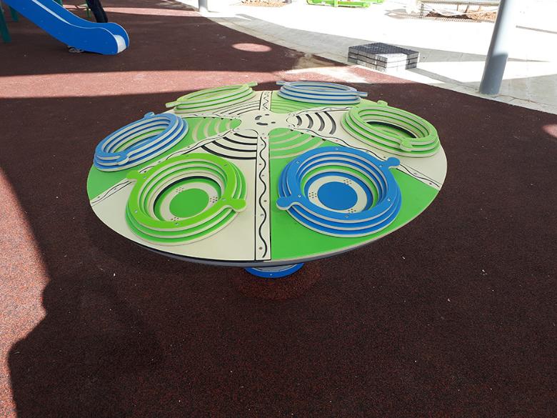 The Psagot Playgrounds Hurricane is a six-seat carousel where each rider gets their own colorful HDPE seat with handholds. Children can grip the handholds for stability or let go for more of a balance challenge, so every rider sets their own difficulty level. It develops vestibular skills, balance, and social coordination. Holds 6 children ages 5 to 12, with a fall height of 3 feet 2.4 inches.