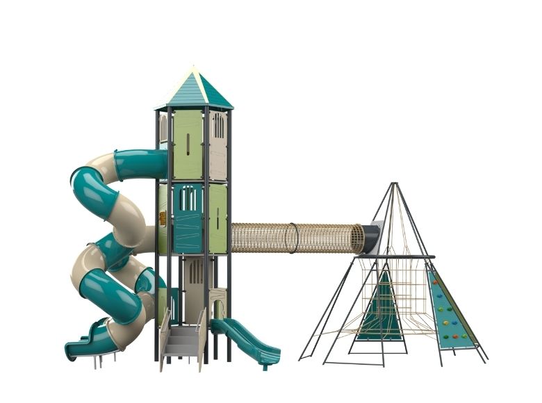 BEST FOR: Parks and schools that want a play structure with a strong visual identity and a clear challenge sequence. The tower-to-pyramid route via the crawling bridge gives kids a mission — get from one end to the other — which is the kind of goal-oriented play that keeps 8-12 year olds coming back. The toddler slide means you do not need a separate structure for the younger ones who are not ready for the tube slides yet.