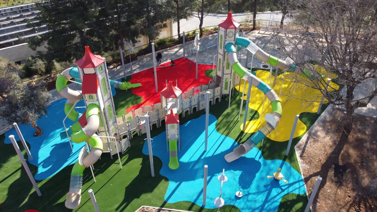 The Psagot Playgrounds TallahasseeB is the largest play system in this catalog — a castle-and-maze hybrid for ages 5-12 that holds up to 416 children. Multiple towers connected by hanging bridges, winding slides, and climbing walls create a structure with serious vertical scale and internal complexity. Kids discover new routes and hidden passages on every visit. ASTM F1487 and IPEMA certified.