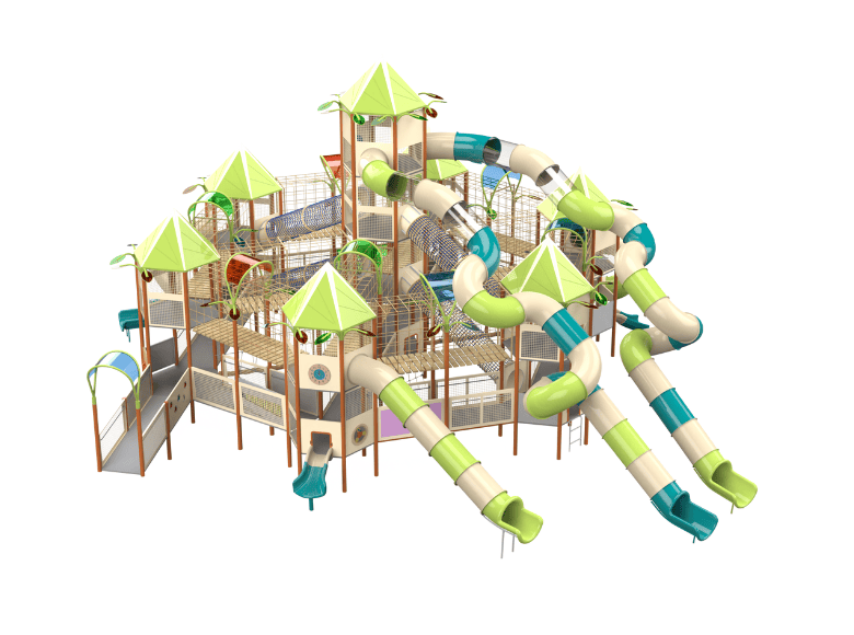 The Washington C earns its place in my catalog with scale and design. The hexagonal towers at different heights give it a medieval fortress silhouette that kids respond to immediately — they want to conquer it. Cable bridges between towers demand focus and balance, crawling bridges add a different movement challenge, and climbing ladders reward persistence. The transparent tube slide at 2.9 meters is a genuine thrill because kids can see the ground rushing by below them as they descend.
