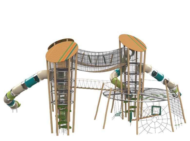 You can configure it with one or two towers depending on your site. Robinia wood with galvanized stainless steel gives you the natural aesthetic without the maintenance headaches, and the open design means caregivers can track their kids across the whole structure without chasing blind spots.