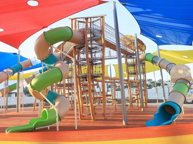 I do not use the word flagship lightly, but the Arya is the one structure in the Psagot Robinia line that changes the conversation about a park. Towers at 6 meters high are visible from a distance, and kids lock onto that 6.7-meter curved slide from the parking lot. Five slides total, climbing walls, rope webs, rubber nets, hanging mazes — there are enough pathways that repeat visits still feel fresh. I have watched kids spend hours working through routes they had not tried before.