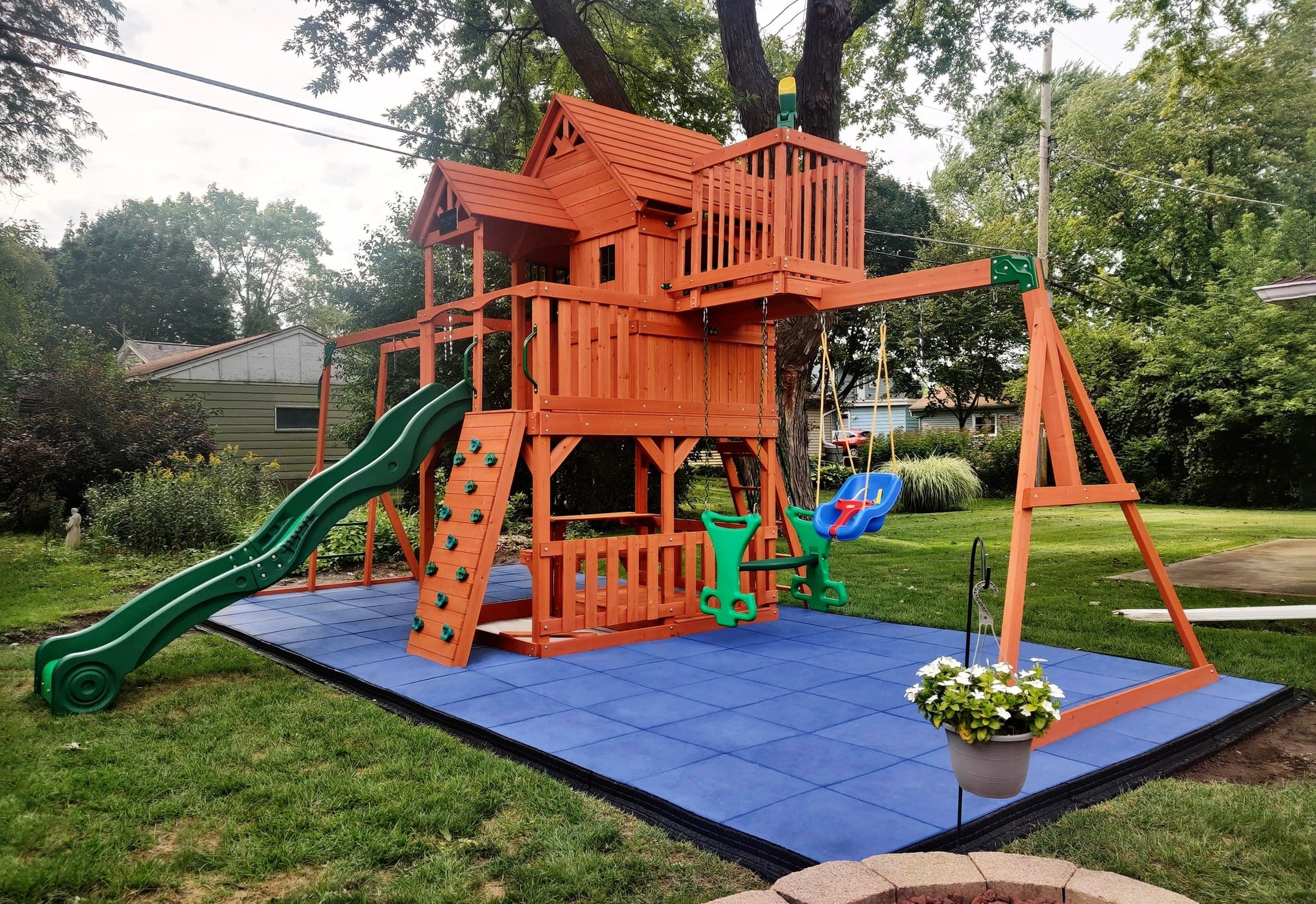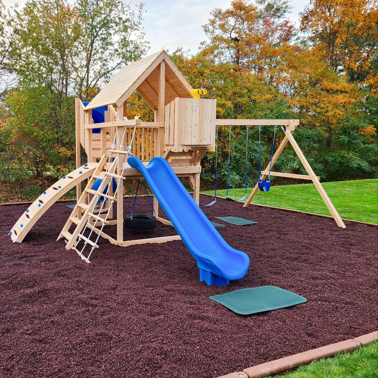 "The rubber material significantly cushions falls, giving parents peace of mind while their kids enjoy the swings and climbing structures."