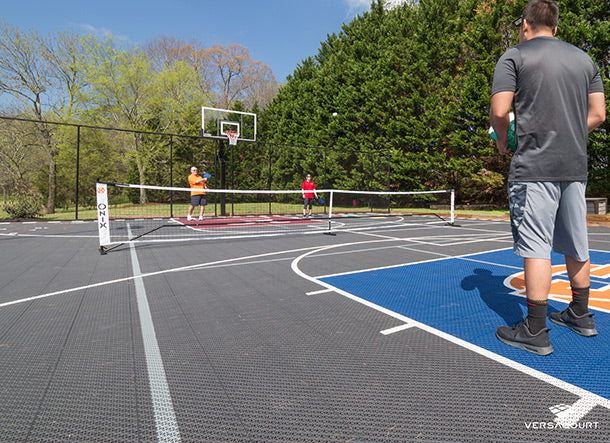 Pickleball is one of the fastest growing sports in the United States. It's an easy game to learn and it's competitive for players of all ages - from young children to senior citizens. Pickleball court lines can be added to your VersaCourt multi-sport game court system, or as a standalone option. We also offer adjustable net systems that can be adjusted to sit at regulation height for pickleball.